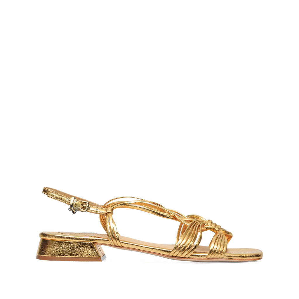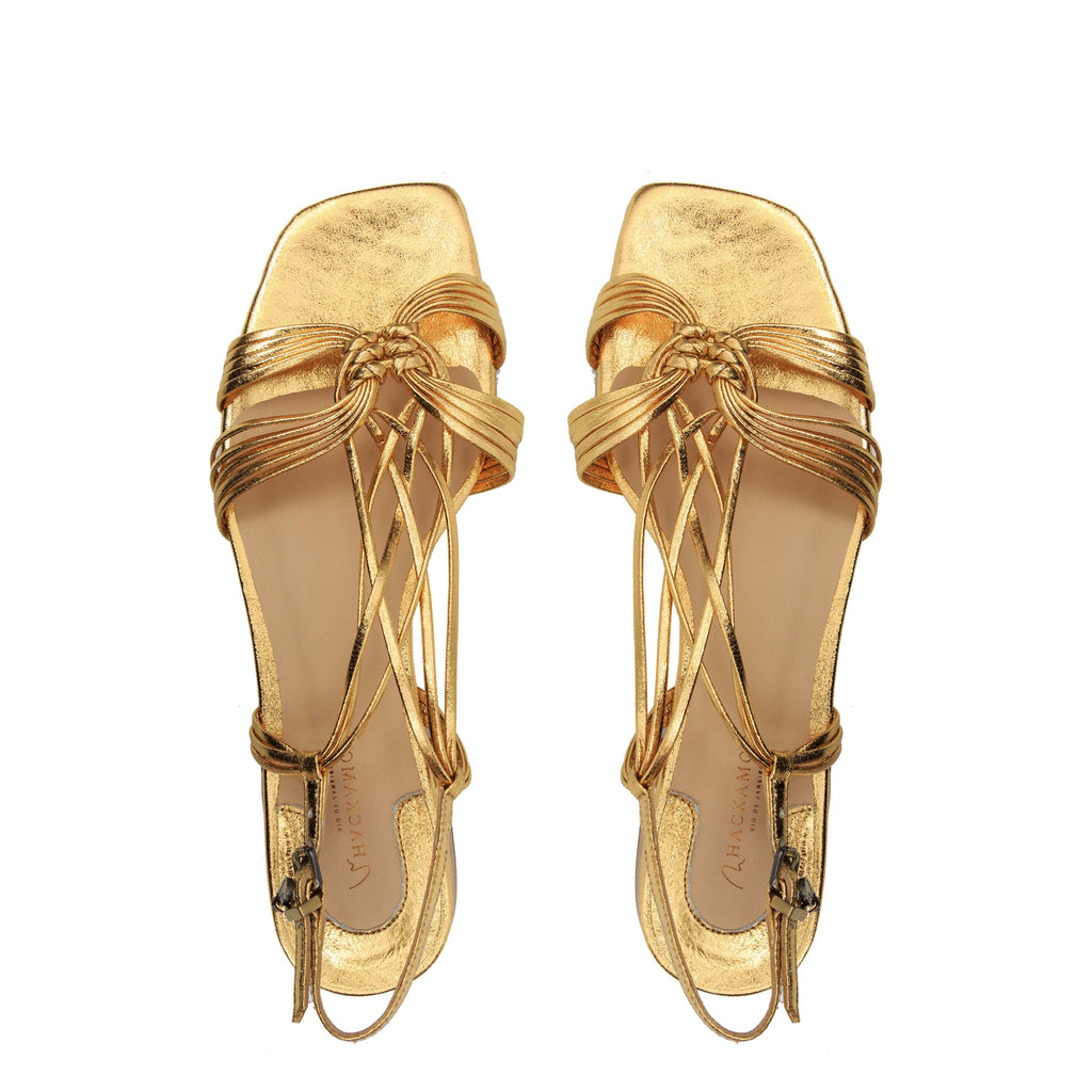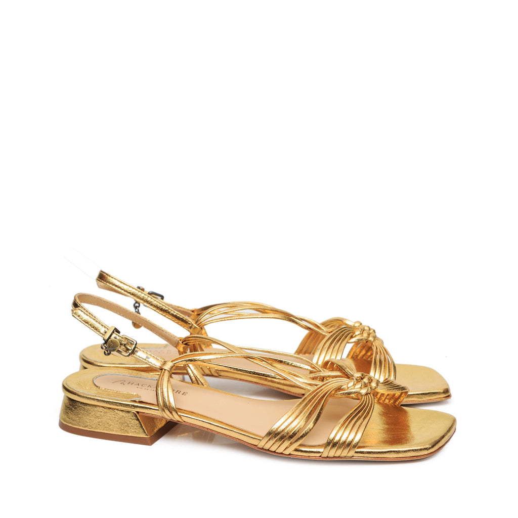- Sandália rasteira confeccionada em couro metalizado no tom ouro de bico levemente quadrado