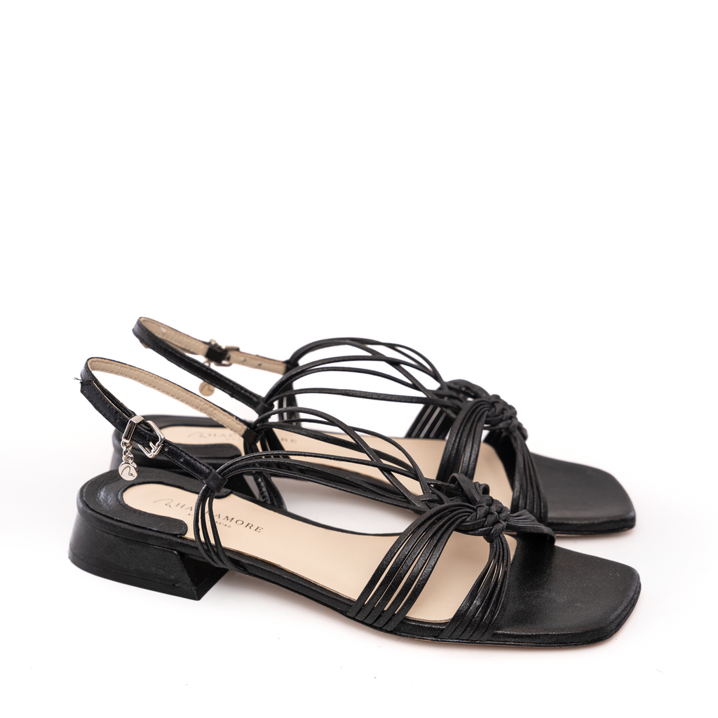 - Sandália rasteira confeccionada em couro camurça cabra no tom preto metalizado de bico quadrado