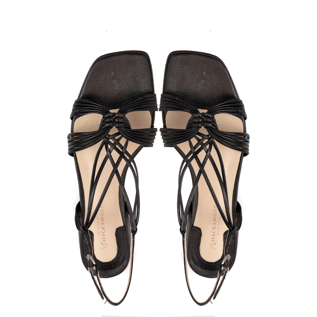 - Cabedal em tiras de couro entrelaçadas confeccionado manualmente