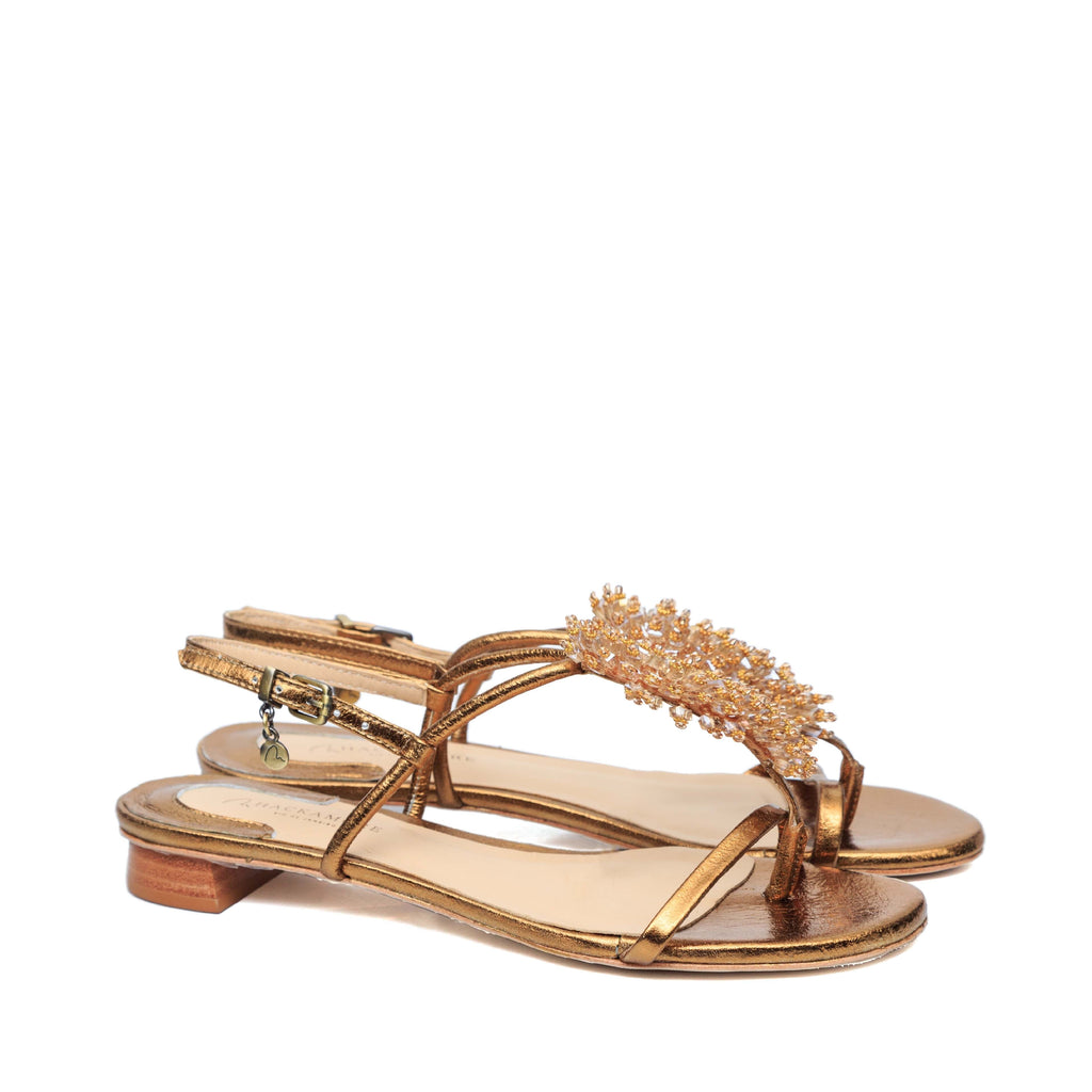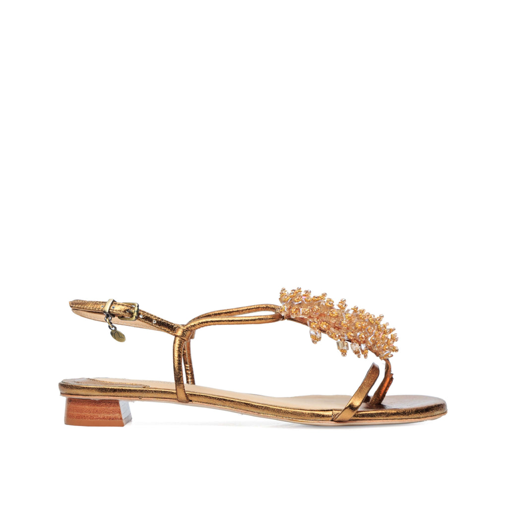 - Sandália rasteira confeccionada em couro metalizado no tom ouro de bico amendoado