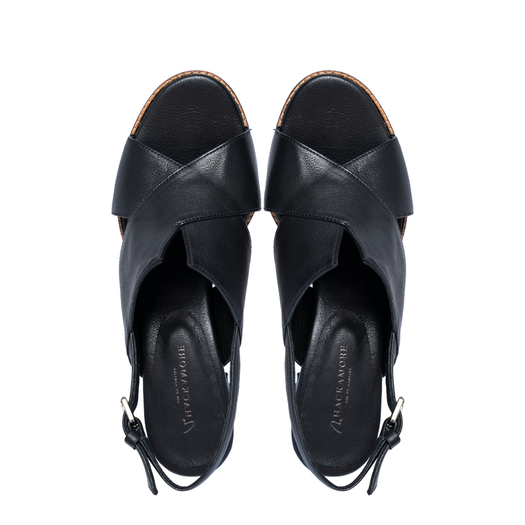 - Sandália alta confeccionada em couro vacum no tom preto com bico amendoado