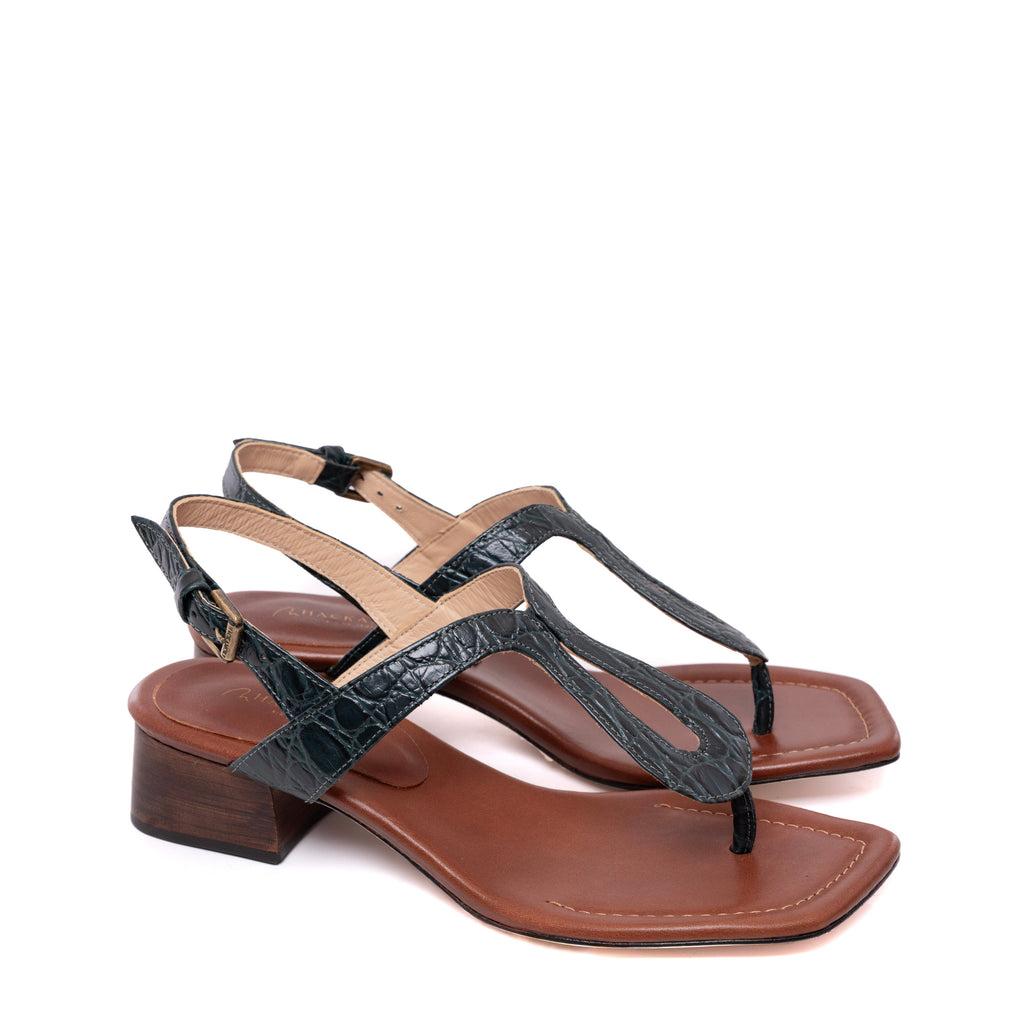 - Sandália média confeccionada em couro vacum estampa croco no tom verde com bico quadrado