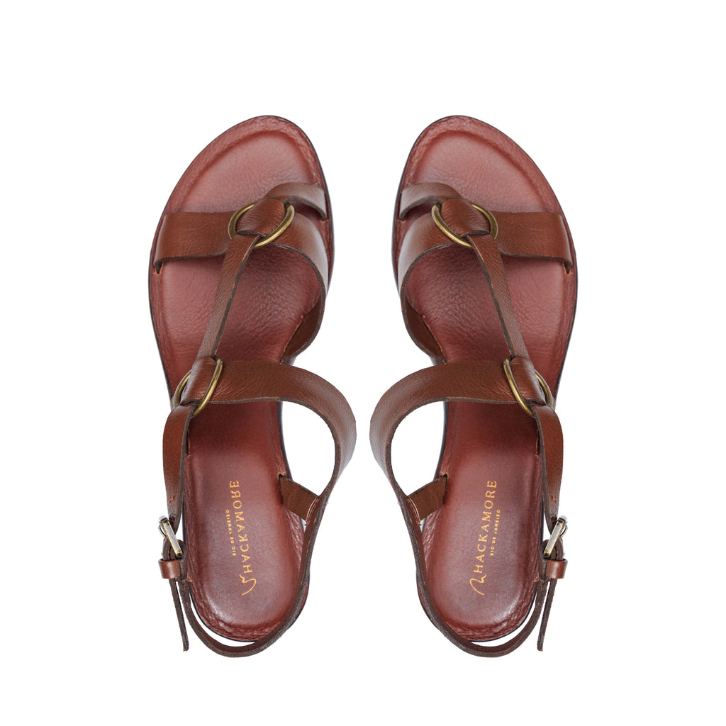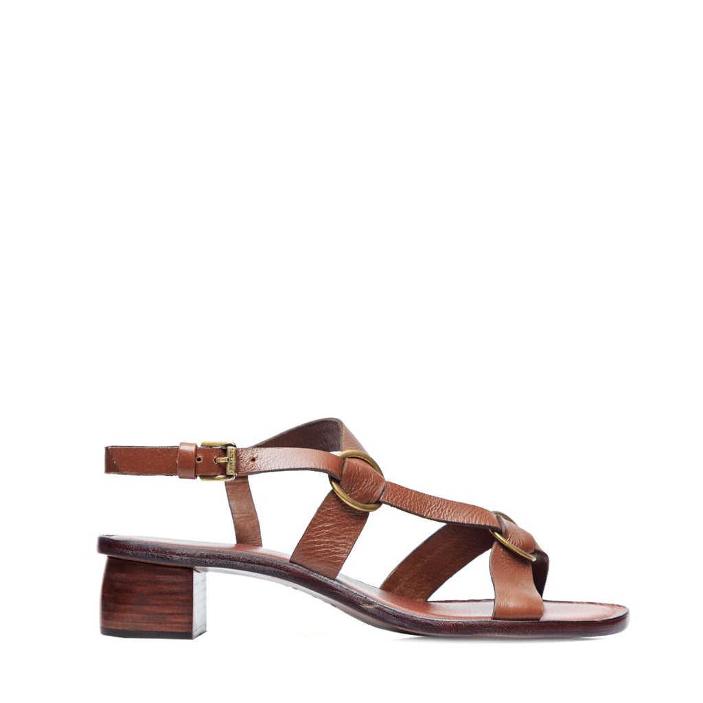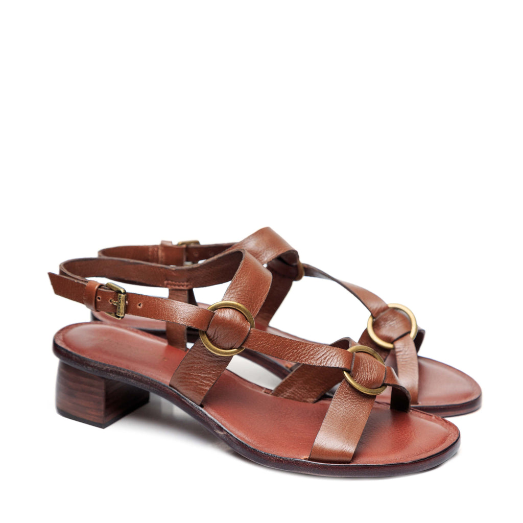 - Sandália média confeccionada em couro selaria no tom chocolate e bico amendoado