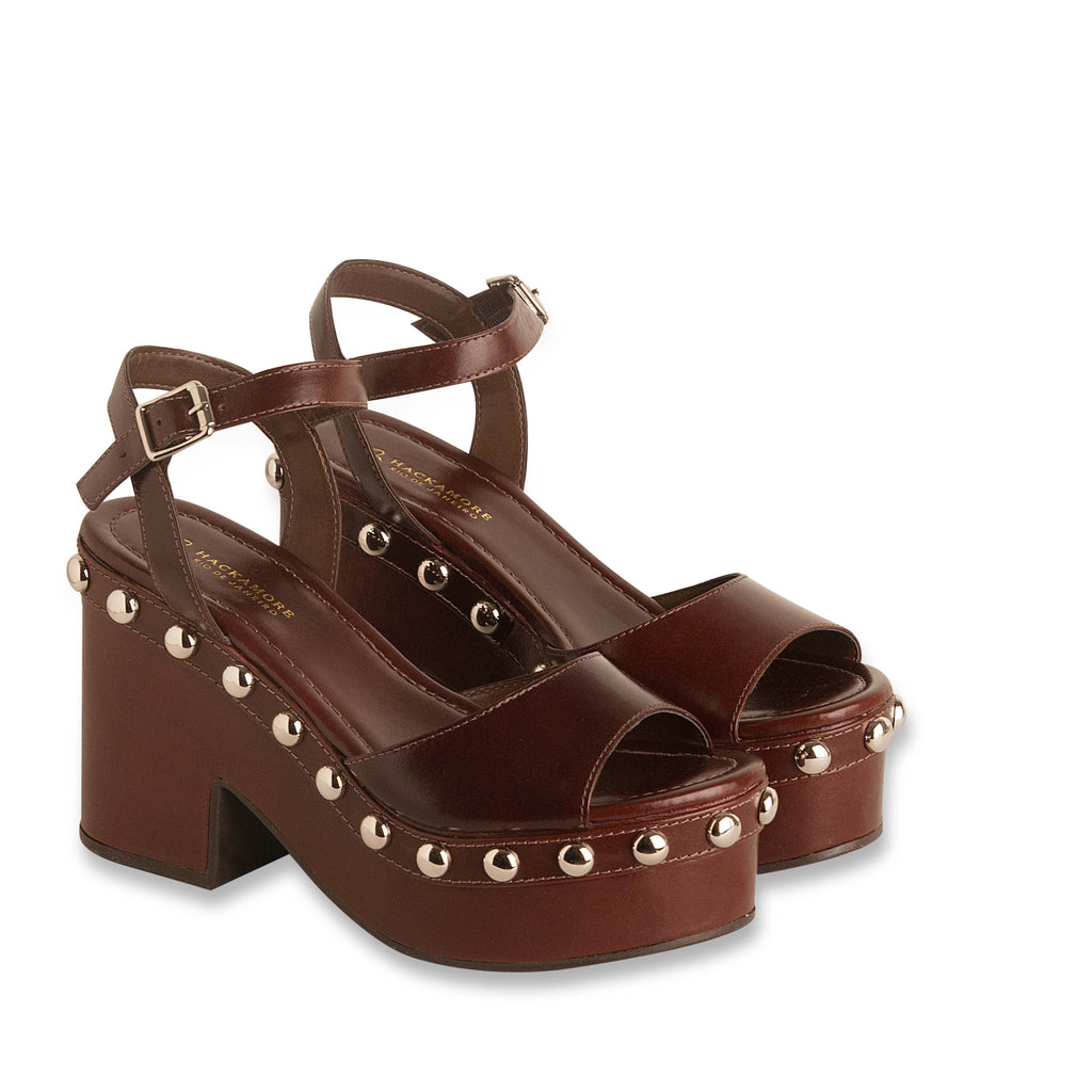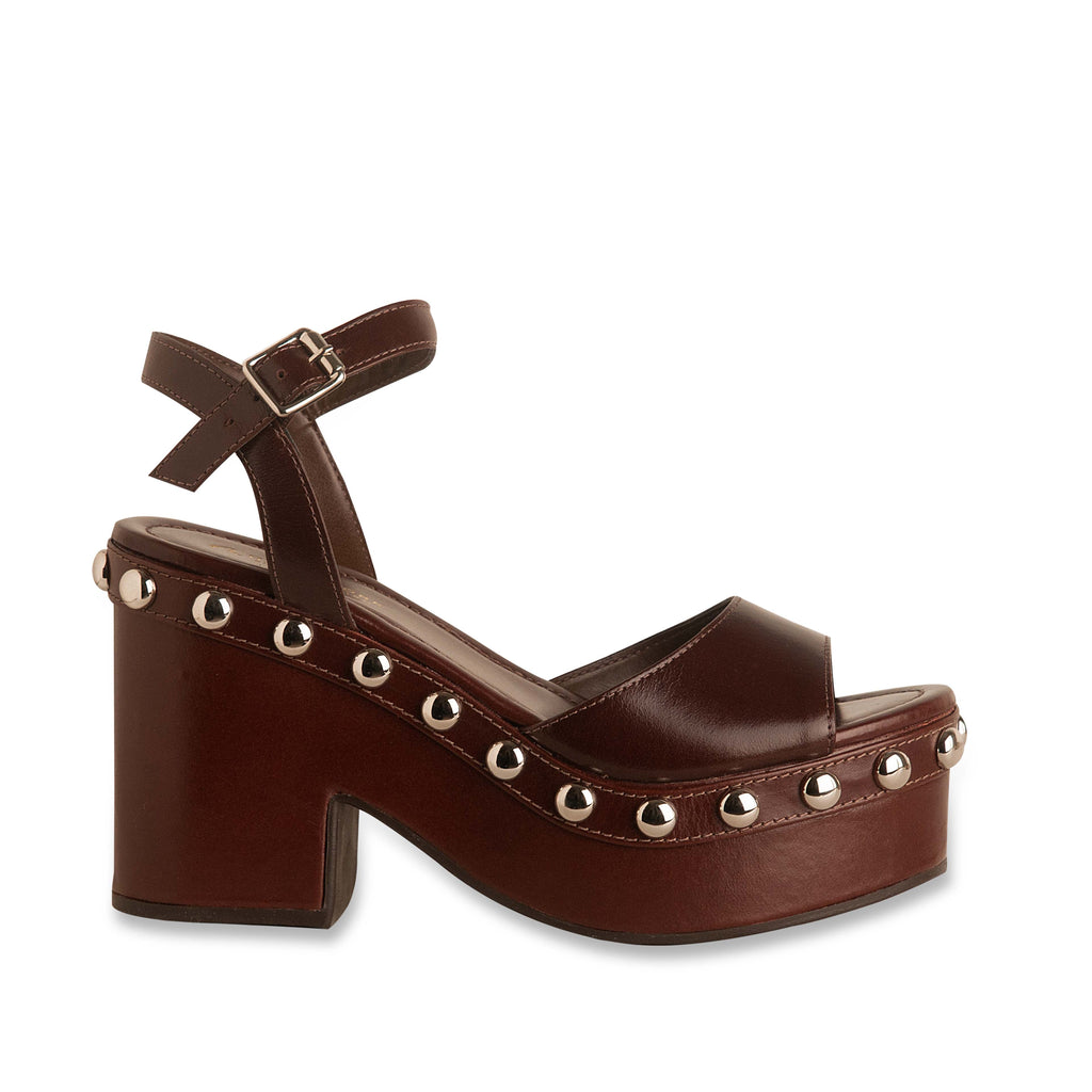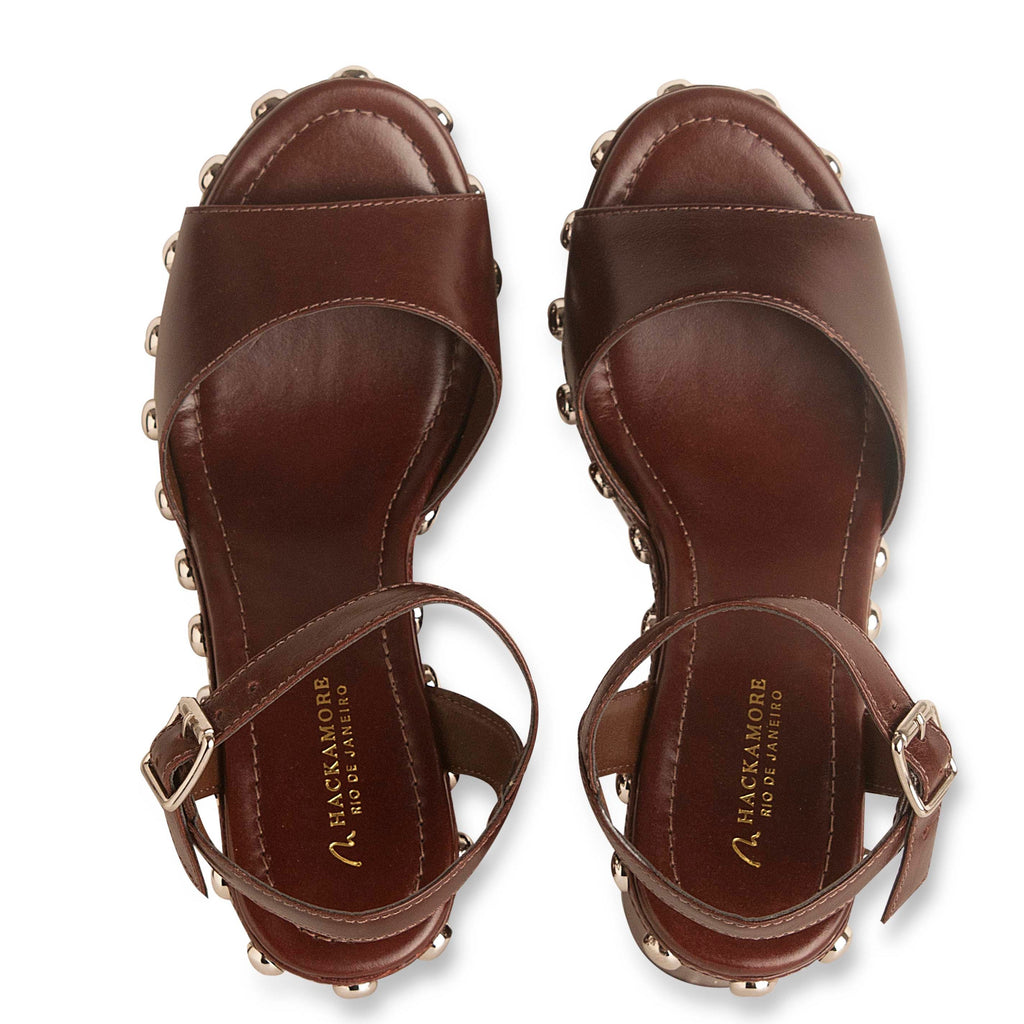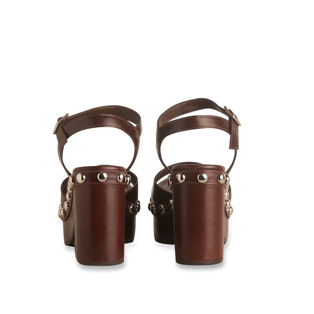 - Sandália tipo tamanco confeccionada em couro no tom cacau, bico amendoado, modelo plataforma