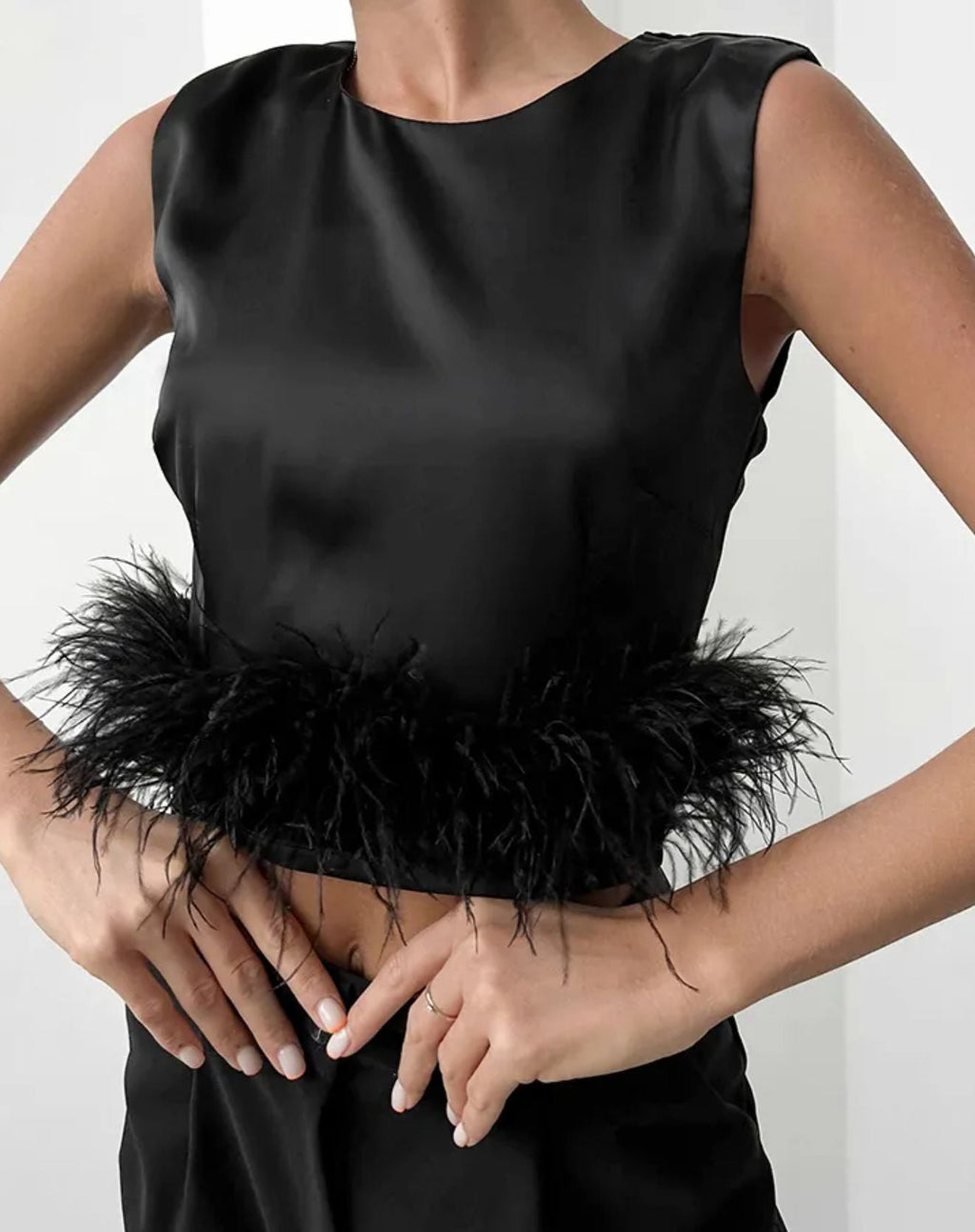Uma peça diferenciada para curtir o melhor das saídas neste verão. A BLUSA PLUMMA SEM MANGAS é a queridinha do momento, podendo ser usada em compromissos diurnos e noturnos. Chic e elegante na medida certa, você vai amar! Possui comprimento curto, sem mangas, zíper traseiro e plumas na barra da peça.