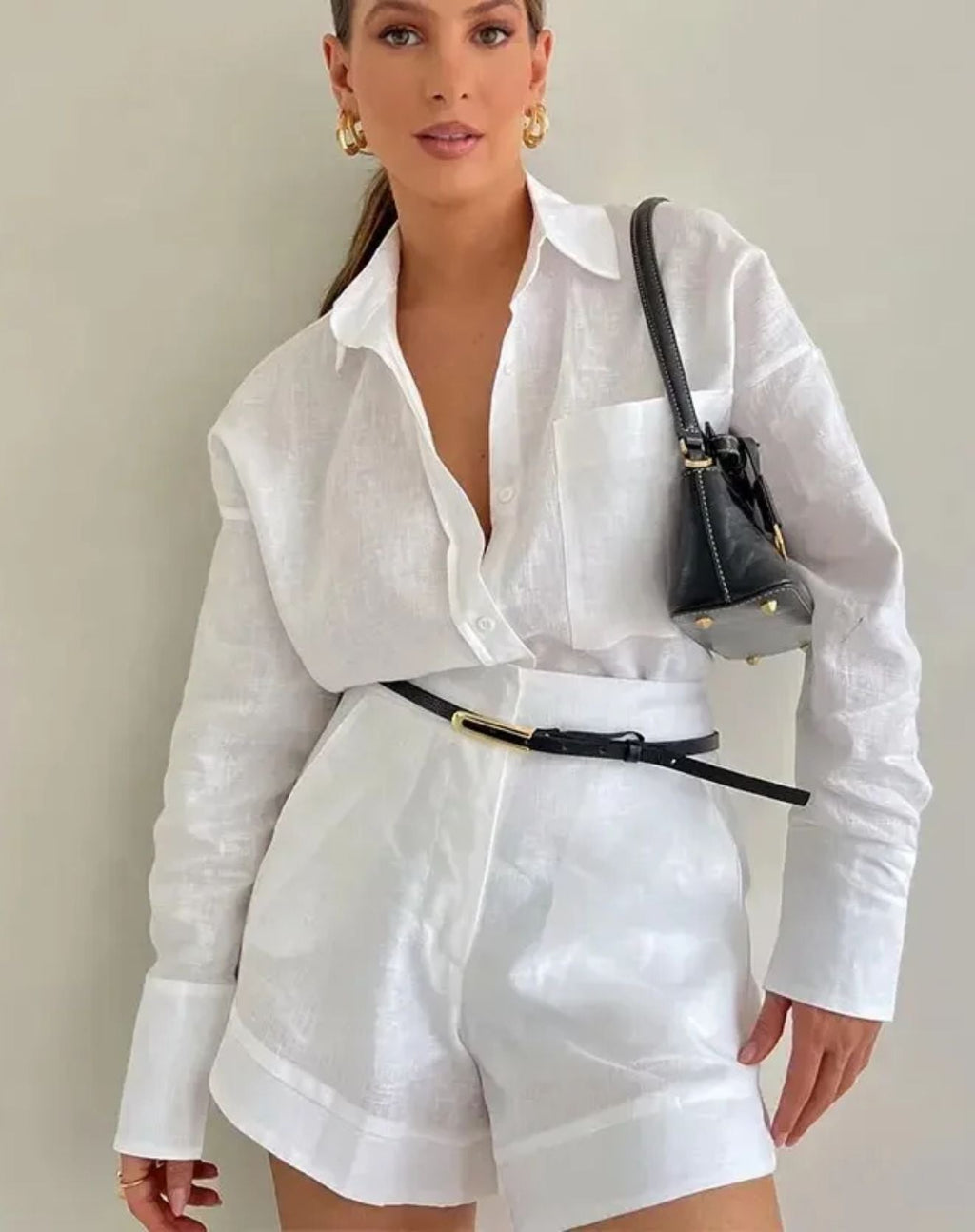 Versatilidade é o sobrenome deste maravilhoso CONJUNTO BIA CAMISA +SHORT DE LINHO, você pode abusar das peças separadamente na hora de montar seu look. A parte de cima é composta por uma camisa de botões, lapela frontal, estilo oversized e punhos largos, já o short, é confeccionado em cintura alta, possuindo fechamento por botão e zíper frontal, passador de cinto, bolso faca e comprimento curto.