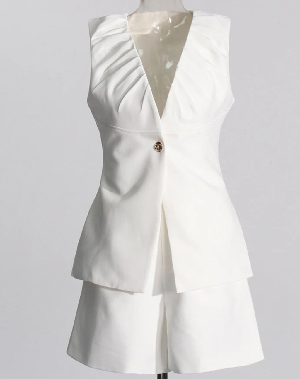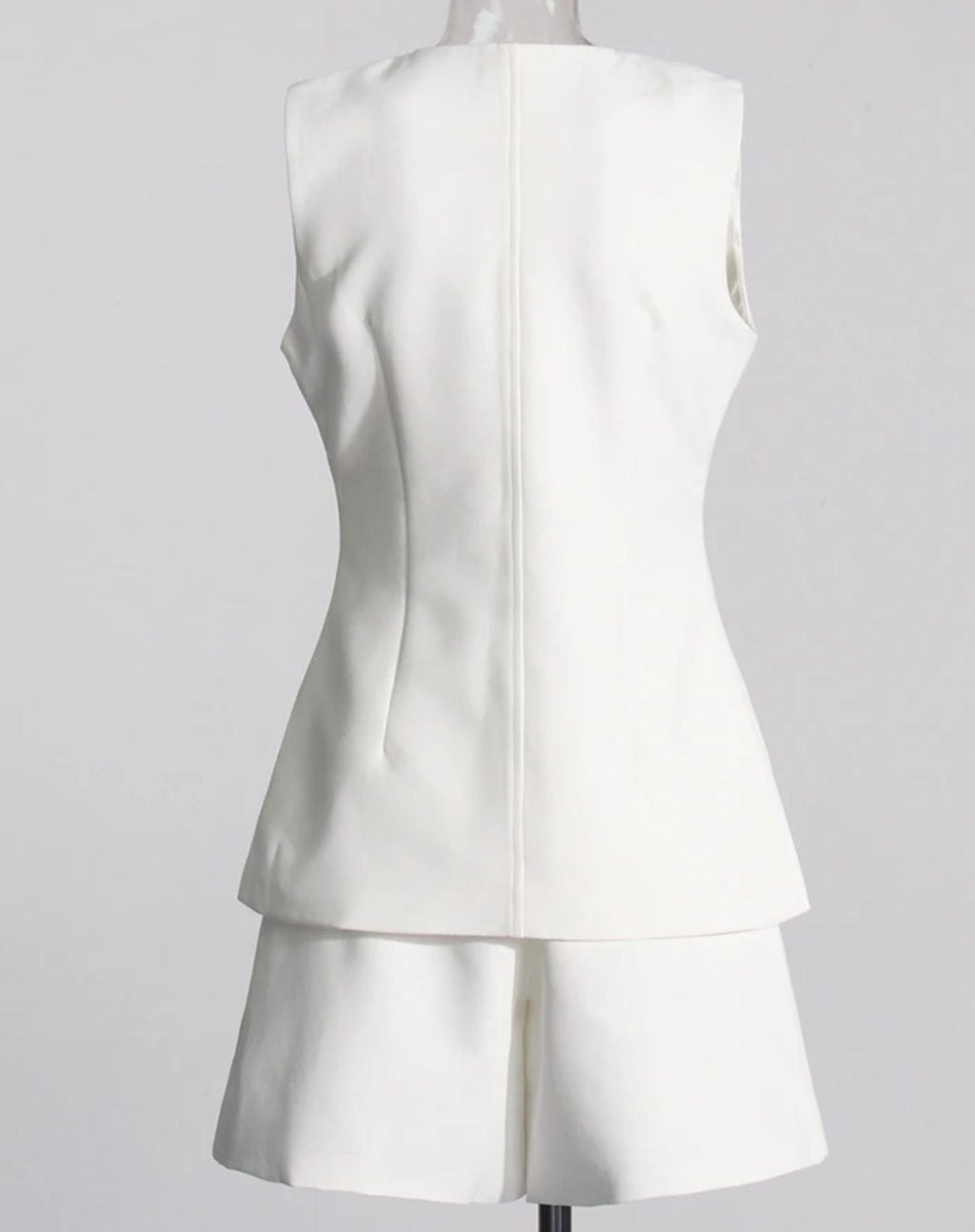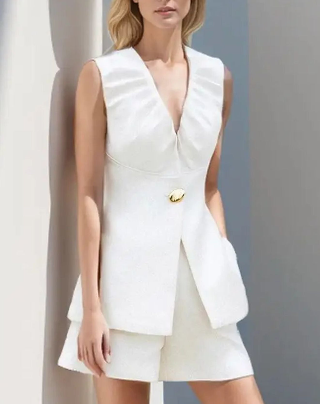 Versatilidade é o sobrenome deste maravilhoso CONJUNTO MEGAN COLETE + SHORT, você pode abusar das peças separadamente na hora de montar seu look. Aposte! O colete possui fechamento por botão dourado frontal, estilo regata, franzido na parte superior e leve abertura na parte de baixo. O short possui caimento reto, fechamento por zíper e botão frontal e bolsos faca laterais.