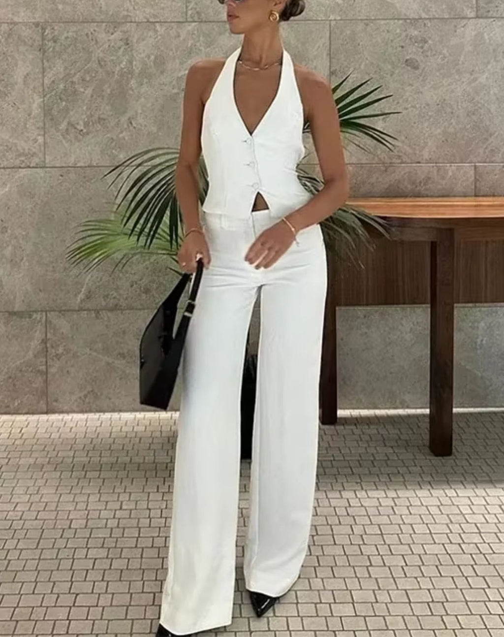 Versatilidade é o sobrenome deste maravilhoso CONJUNTO MONIQUE BLUSA FRENTE ÚNICA + CALÇA, você pode abusar das peças separadamente na hora de montar seu look. A blusa possui frente única, com decote em V, fechamento por botões frontais, estilo curto e aberta nas costas. A calça é estilo pantalona, fechamento por zíper e botão frontal, caimento reto e largo. Você vai amar!