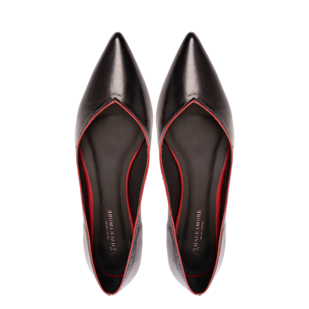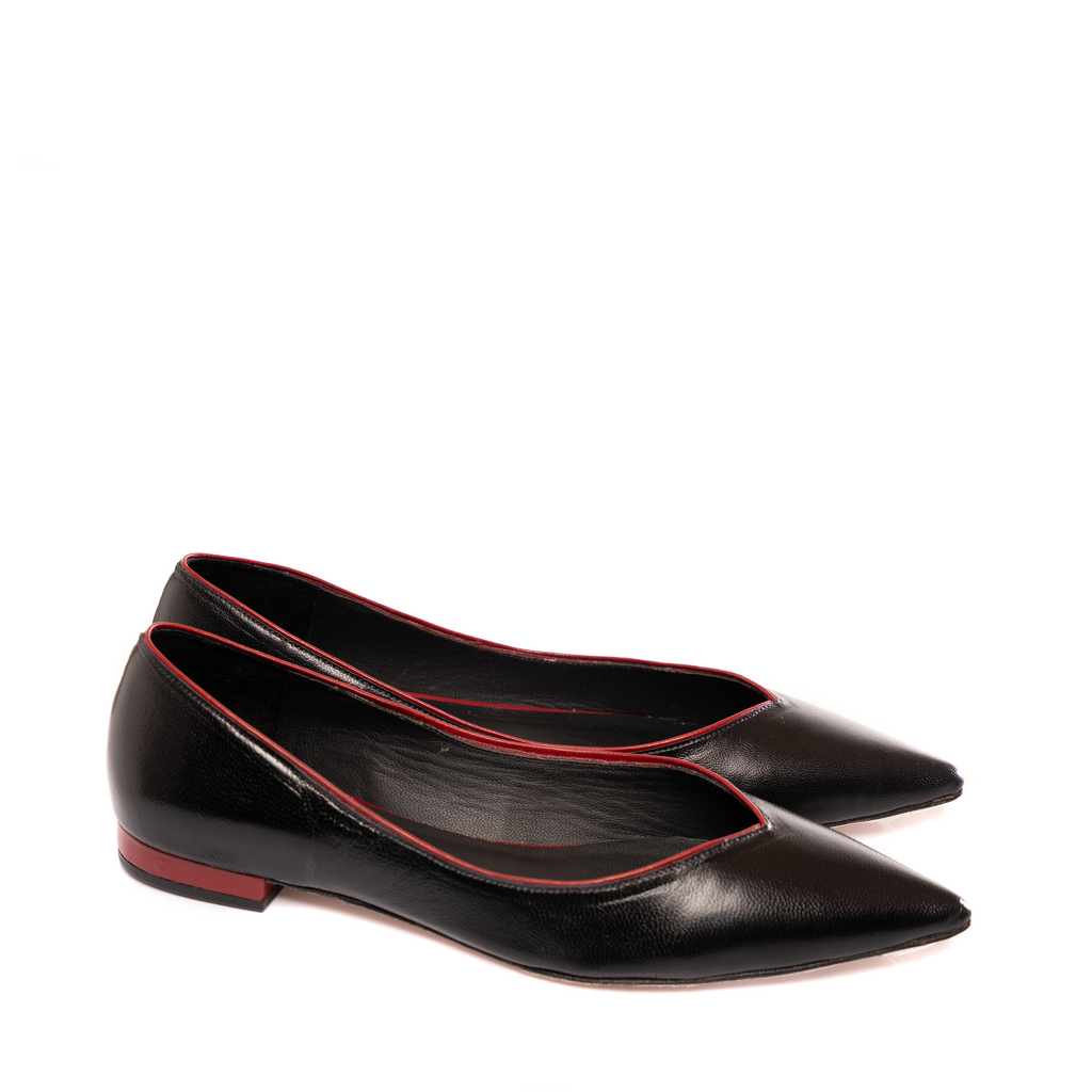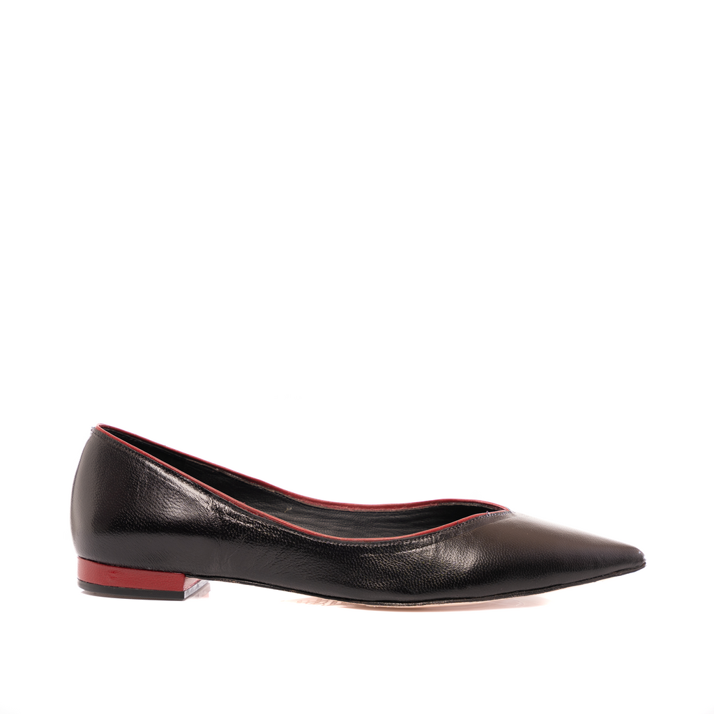 • Sapatilha confeccionada em couro pelica no tom preto e bico fino