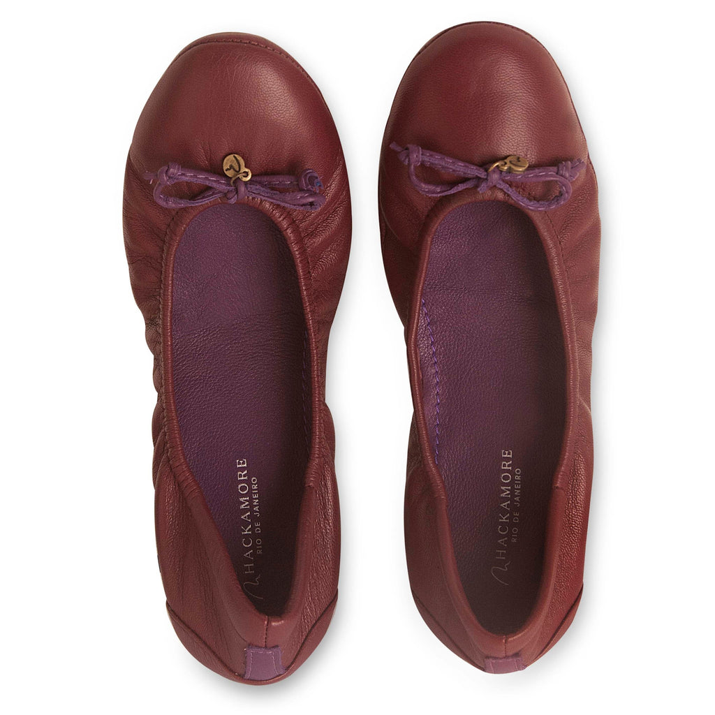 - Sapatilha confeccionada em couro mestiço no tom rosso, modelo bailarina, arredondado, com elástico e design flexível