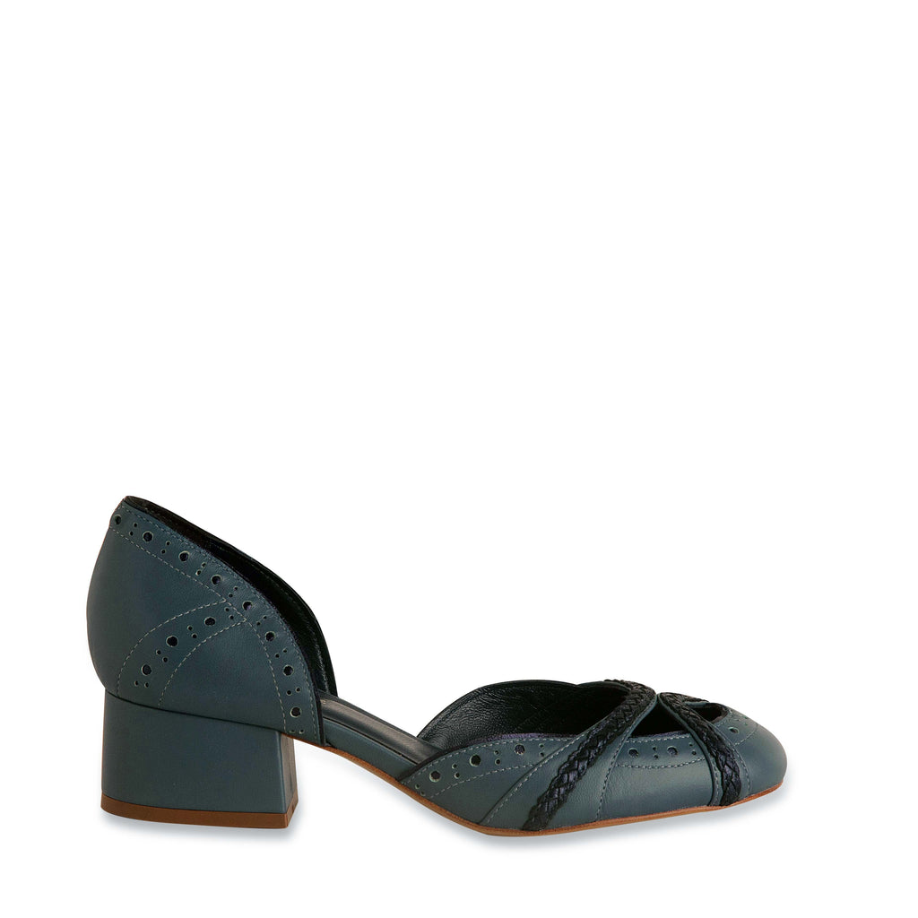 - Scarpin confeccionado em couro mestiço no tom azul denim e detalhes em couro pelica no tom marinho metalizado, modelo d’orsay que se caracteriza pela abertura nas laterais, bico arredondado