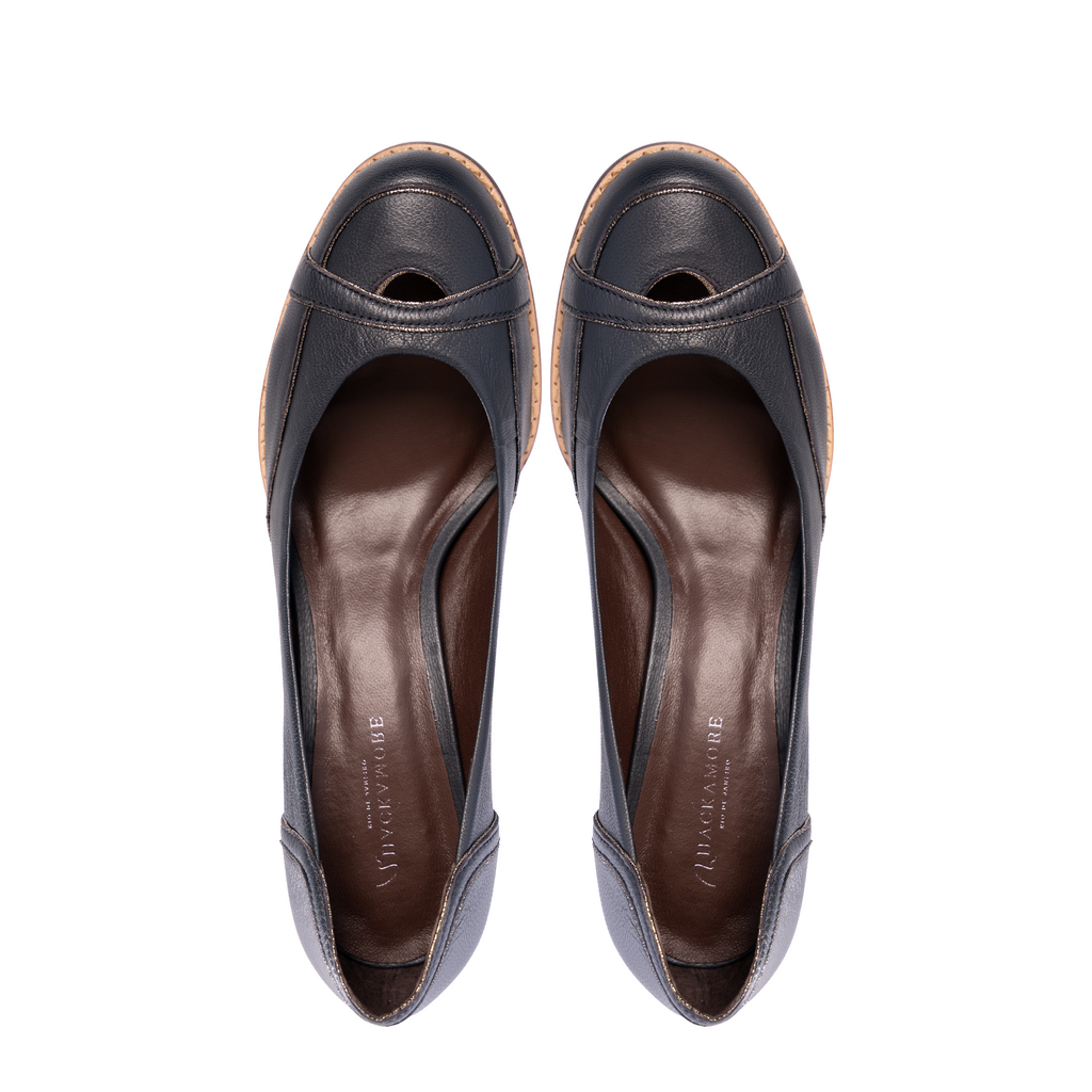 • Scarpin feminino confeccionado em couro mestiço no tom cobalto com detalhe de vivo francês em tom      prata velho, realçando os detalhes do modelo