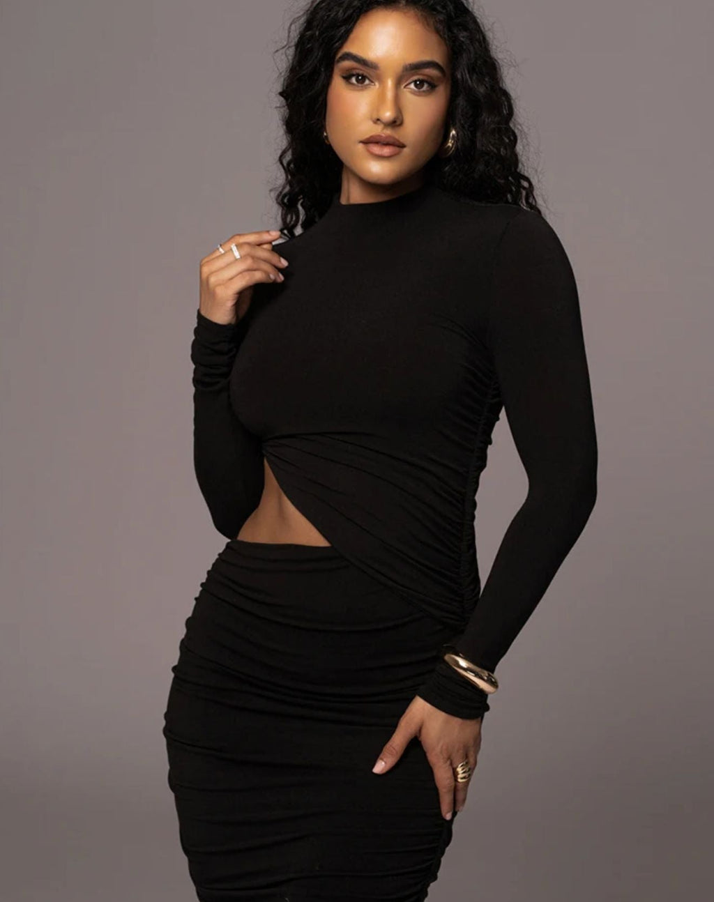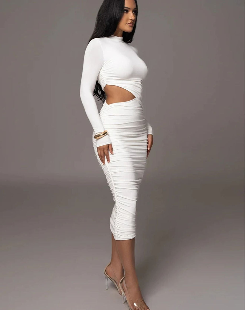 A elegância que você busca se encontra no VESTIDO MIDI ANGEL COM CORTE FORA NA CINTURA a peça que modela perfeitamente o seu corpo, sendo perfeito para sair para festas e eventos especiais. Esse midi com corte fora na cintura te deixará linda e diferenciada, além disso possui um caimento justo ao corpo, mangas longas, mini gola e franzido frontal.